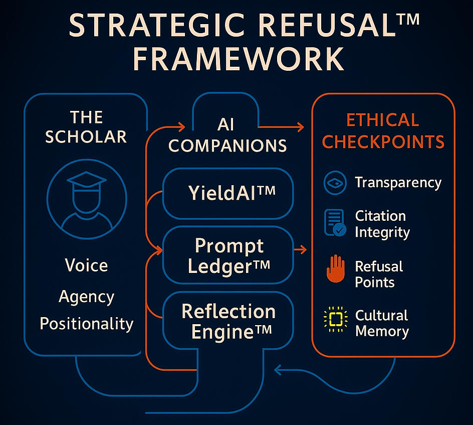 Artificial Intelligence can generate answers at lightning speed — but it can’t tell you what to stand for.That’s where Ethical Intelligence begins.The Strategic Refusal™ Framework was designed to make that shift possible.At its core, it’s not just a decision-making tool — it’s a call to conscience.It’s a living system that supports scholars, educators, and creators in protecting integrity, reclaiming narrative power, and resisting epistemic erasure in AI-assisted work.